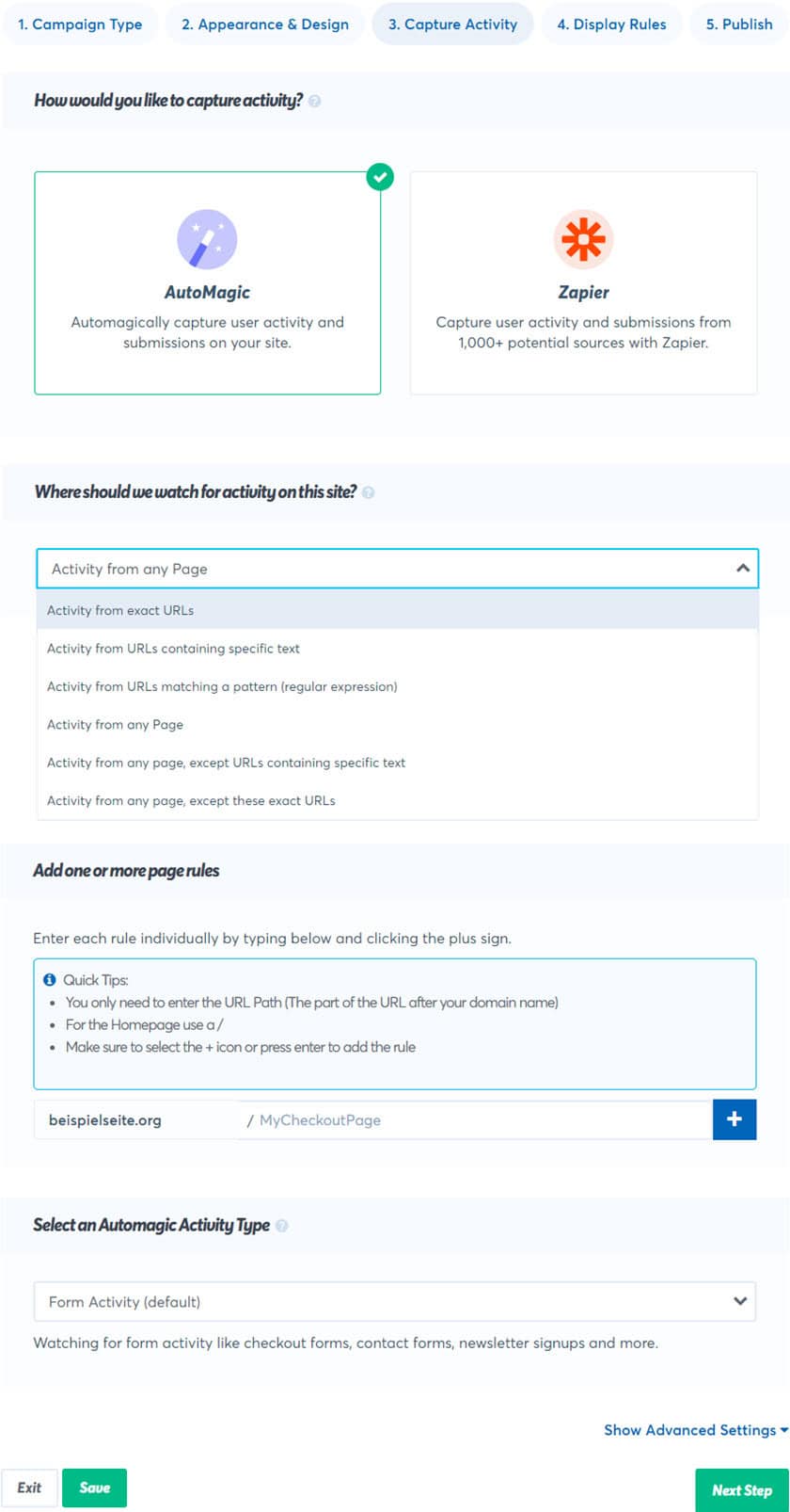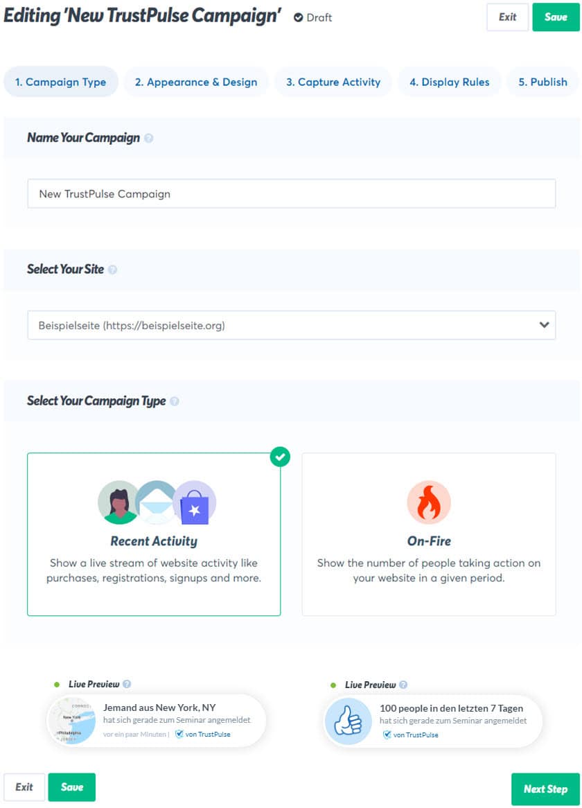 Man erstellt seine Kampagne, wählt die Seite aus und wählt die gewünschte Art der Aktion, auf die Trustpulse reagieren soll.