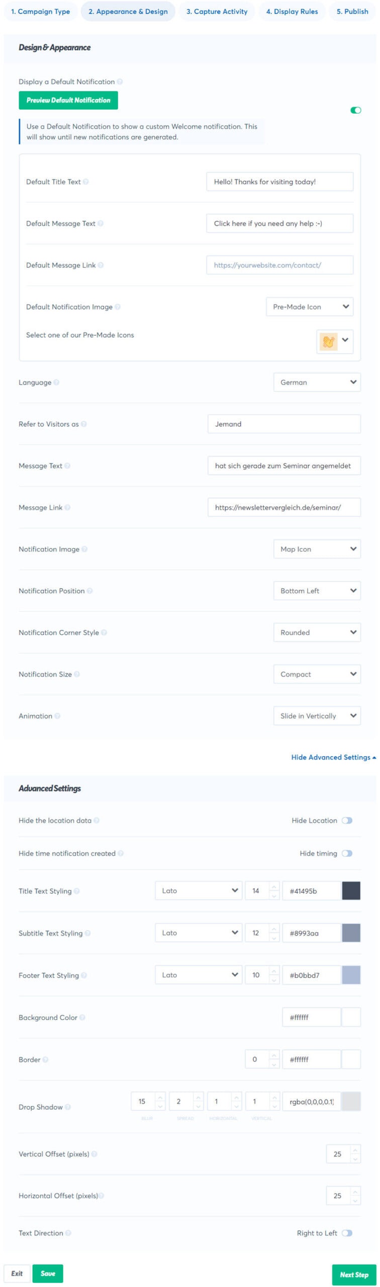 Außerdem lassen sich Anzahl und zeitlicher Abstand zwischen den Benachrichtigungen einstellen, wie sich Trustpulse verhalten soll, wenn jemand die Benachrichtigung schließt, ob es auf Mobilgeräten gezeigt werden soll und Anzahl und Alter der Benachrichtigungen.