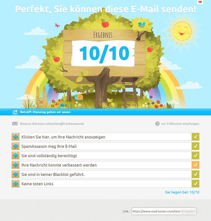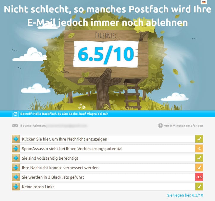 Mail Tester prüft dann innerhalb von Sekunden deine E-Mail auf Probleme.