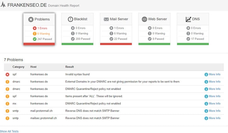Der DHR prüft die E-Mail Konfiguration, den Webserver, die DNS-Einträge und schaut, ob und wie alles zusammen passt.