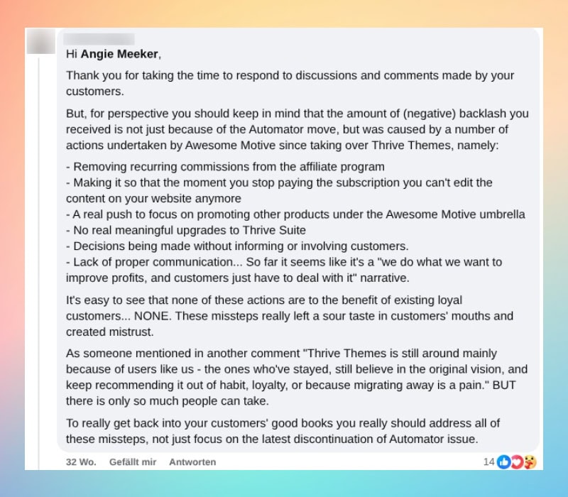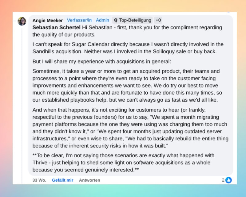 Und der Hinweis, dass viele Nutzer nur noch da sind, weil die Umstellung weg von Thrive schmerzlich ist, weil es Zeit und Aufwand bedeutet. Aber auch, dass die Kunden nicht unbegrenzt belastbar sind.