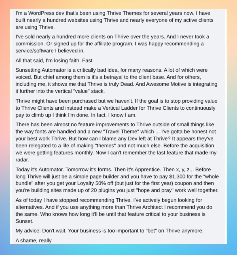 Dieser Nutzer sagt offen, dass er mit diesem Tag aufgehört hat, Thrive zu empfehlen und sich nach Alternativen umschaut.