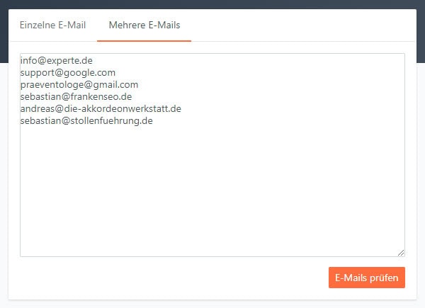 Eine Prüfung von vielen Adressen läuft analog: einfach alle Adressen (eine pro Zeile) in das Feld eintippen oder kopieren und prüfen lassen.