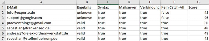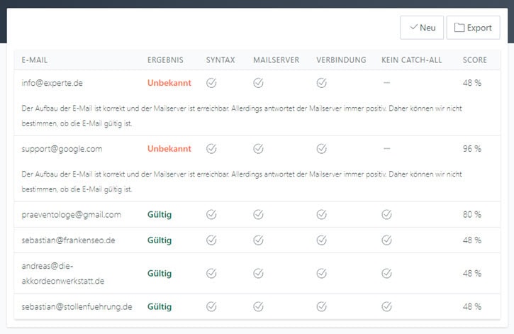 Der Experte .de E-Mail Prüfer ist sehr einfach aufgebaut, einfach zu bedienen und liefert Ergebnisse, die sich auch exportieren lassen.