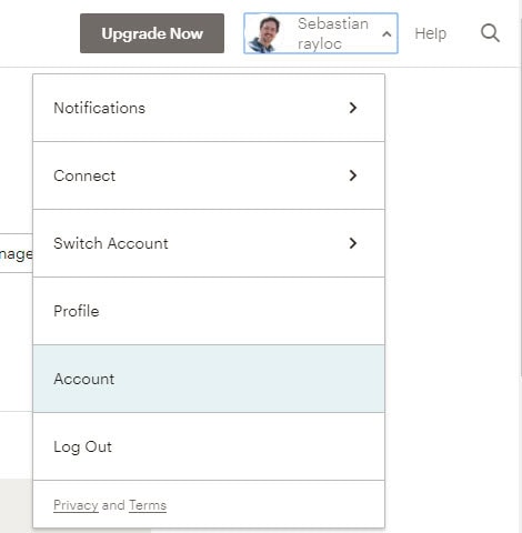 Über einen Klick auf den Namen öffnet sich ein Untermenü mit den Punkten “Notifications”, “Connect”, “Switch Account” (falls man mehrere Konten verwaltet), “Profile”, “Account” und “Log Out”. Hier einfach auf ACCOUNT klicken.