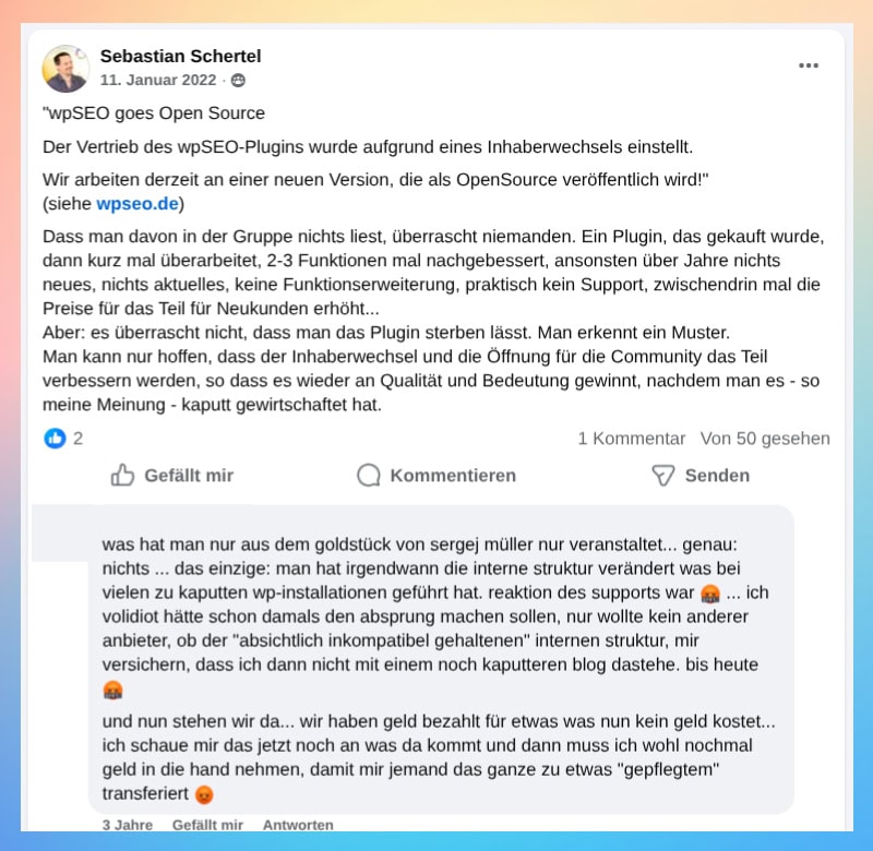 Sergej Müller gab auf Google+ sehr kurz nach der Übernahme von wpSEO durch Eisy bekannt, dass er einen Fehler gemacht hat und das Plugin nicht an ihn hätte abgeben dürfen.